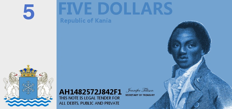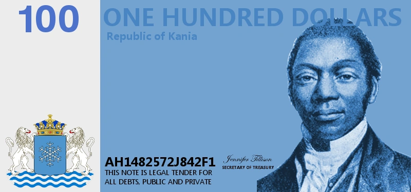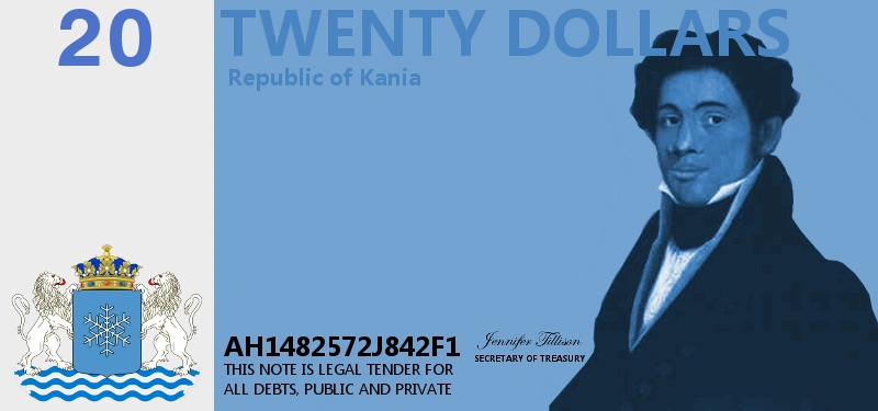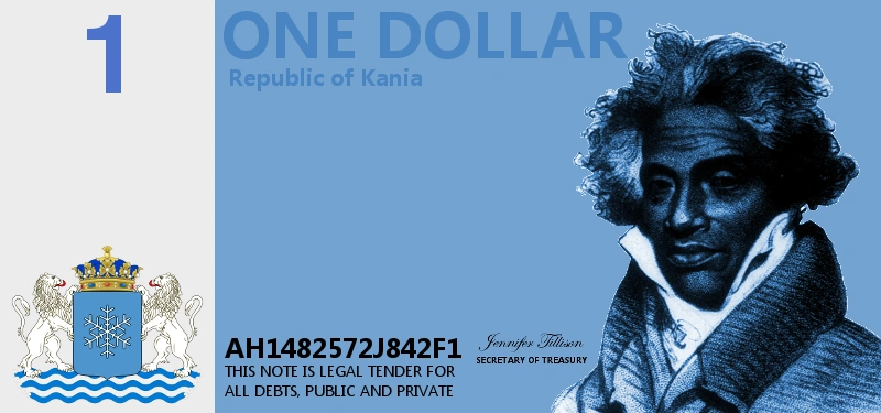 Until the death of Roger Kane in 1775, money did not depict faces of Kanian presidents, as Kane himself stated that it was tantamount to personality worship. He said that only once he died could the people wish to put his face on their money. Until 1912, Roger Kane's face was depicted on all of the money issued by Kania. This became an issue when members of the Federal Senate of Kania sought to put the face of President Henry Kane on the money as well. In keeping with the request of his ancestor to not have the face of family on the money, Kane enacted the New Dollar Act of 1912, which placed the faces of Kania's founding fathers on the money, Roger Kane's included, so as to end the issue of placing his or that of his descendants on the Kanian dollar.
